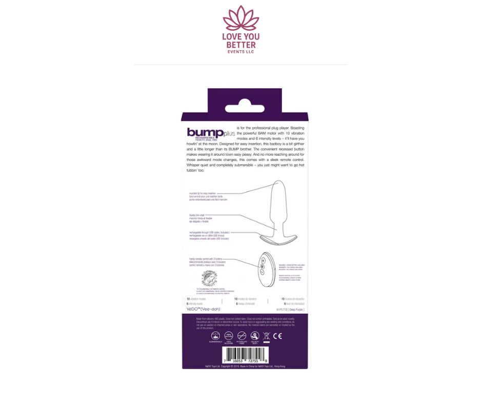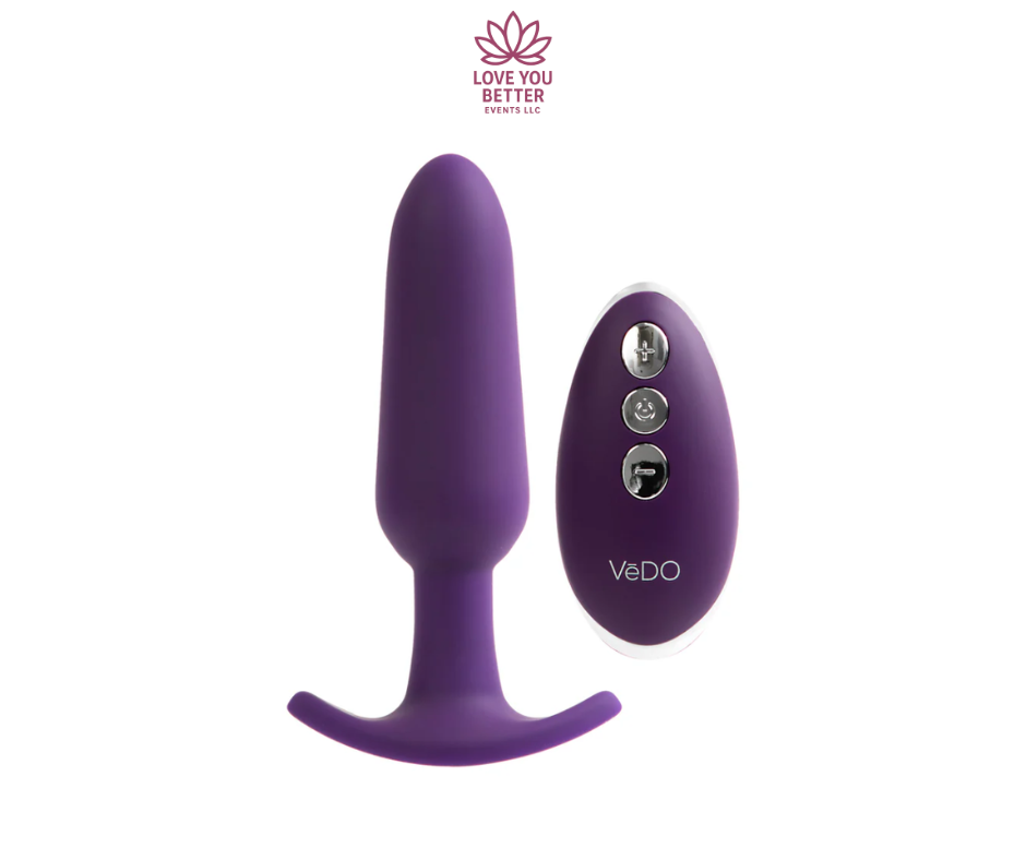 The VeDO Bump is booty power in a slim, tapered size. This velvety silicone plug offers 10 intense vibration modes that wont disappoint. The Bumps recessed power button lets you sit or rock on the plug without worrying that youll accidentally change speeds or power off. The tapered design and smaller size make it an ideal choice for someone whos new to a nal play, or for anyone who prefers a slimmer plug. Submersible for bathtime fun and fully rechargeable, the VeDO Bump is both easy to insert and comfortable for extended wear.