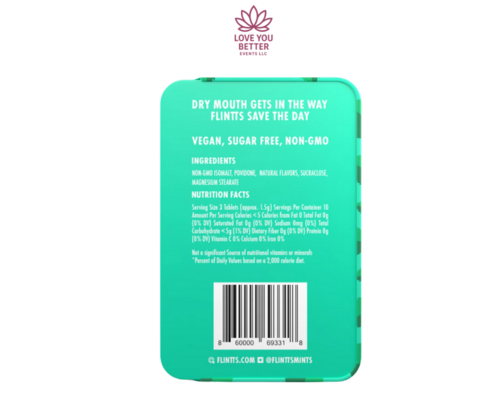 Flintts Mints are quick-dissolving mints that make your mouth water in order to combat Dry Mouth. Saliva includes minerals that keep your teeth hard as well as digestive enzymes that clean the surface of your mouth. Over time, Dry Mouth can cause serious oral health issues. Medium sparkle and mouth watering effect. Spearmint that cools what it touches. Breath-freshening. Winter Vibes. INGREDIENTS Flintts are made with best pharmaceutical-grade ingredients available. This ensures a safe and uniform experience. We use ingredients that are vegan and absent of genetically modified organisms. We have also made a commitment to choose ingredients with minimal impact on the environment by maximizing biodegradability and minimizing toxicity. NON-GMO ISOMALT – A sugar substitute with a near-zero glycemic index. It's made from beets grown without any genetic modification. It provides pleasant sweetness and a slight cooling sensation, and is teeth-friendly. SUCRALOSE – An extremely common non-caloric sweetener. It is made from sugar. We chose this sweetener because of its near-zero toxicity to both people and the environment. Even better, it tastes nice. We use a top-of-the-line sucralose, sourced from Germany, which does not include bulkening starches that generally contain GMO product. MAGNESIUM STEARATE – This aids in the flow of powder ingredients to ensure uniformity of formula. Ours is produced from sustainable palm oil. NATURAL FLAVOR – The 'nutrition label' name for our blend of plant extracts, which each contribute to the mints' mouth-watering and sparkling effects. Mainly, Flintts' superpowers come from the Spilanthes flower