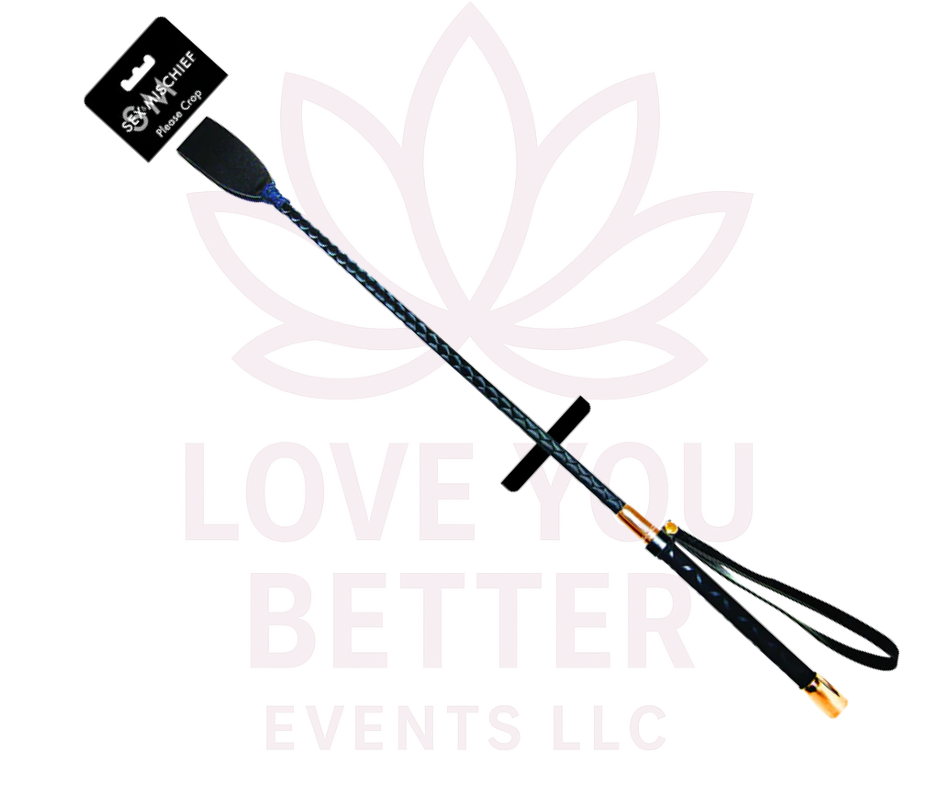 Hand-wrapped crop features tight webbing on the ribbon-braided shaft, a faux braided handle, rose gold caps and a black wrist loop. Entire crop measures 23.5 in long. Vegan Friendly